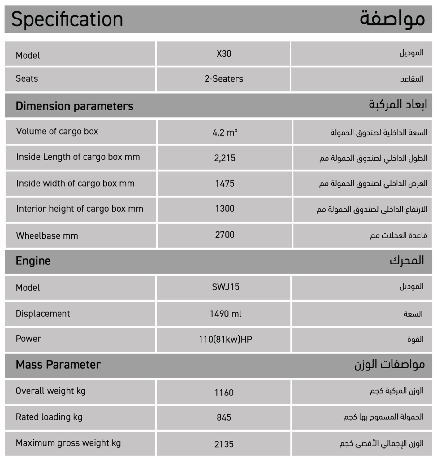 مصممة لأقصى قدر من الاستفادة، تتميز بصندوق حمل فسيح تبلغ سعته 4.2 متر مكعب لاستيعاب الأحمال الكبيرة. وبفضل حمولتها المصنفة العالية البالغة 845 كجم وقاعدة العجلات الصلبة البالغة 2700 مم، تجمع X30 بين المناولة الرشيقة والمتانة الموثوقة، لتصبح شريكاً ذكياً وقادراً لنشاطك التجاري.