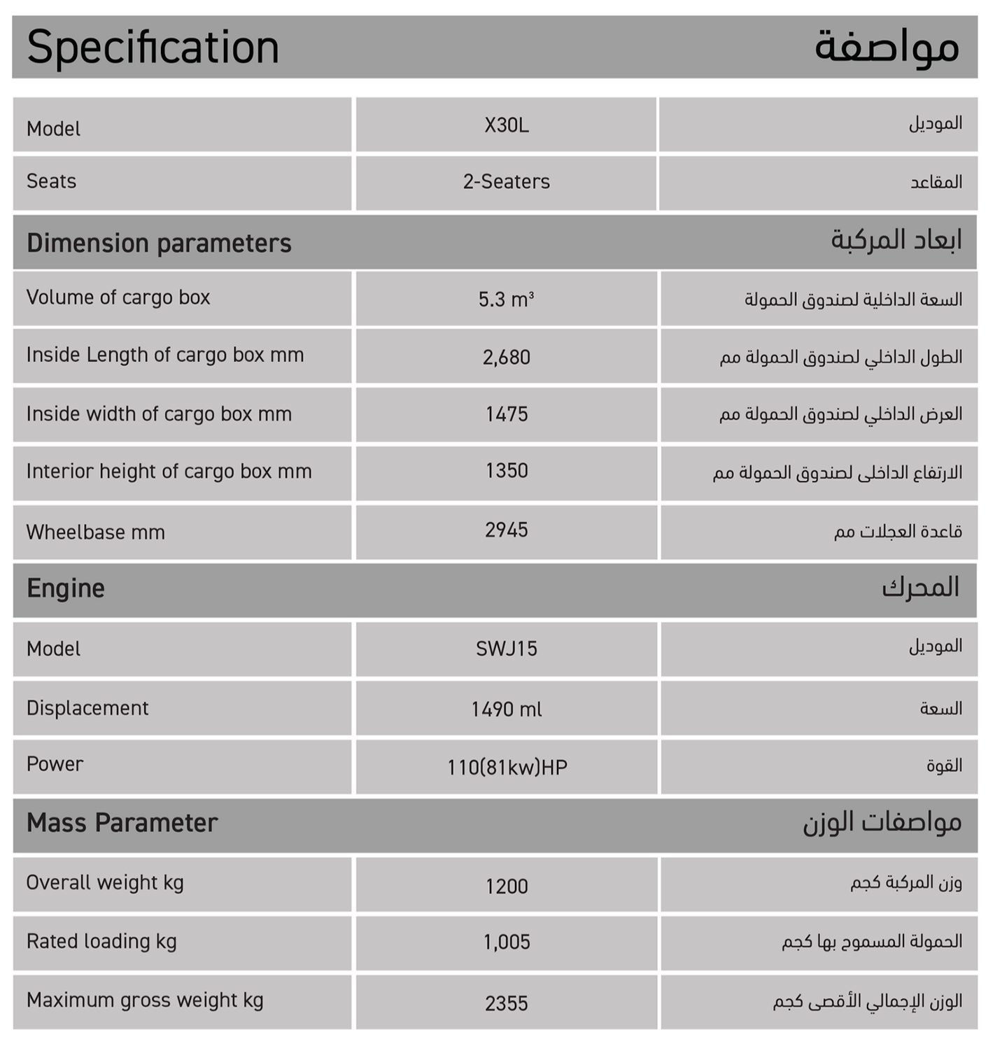 I am Interested!تأخذ شاحنة شينيراي إس آر إم X30L مفهوم الشاحنة الموثوق إلى مستوى أوسع. فهي تشترك بنفس محرك SWJ15 القوي بقوة 110 حصان، ولكنها تقدم صندوق حمولة أكبر بكثير تصل سعته إلى 5.3 متر مكعب، وذلك بفضل طولها وقاعدة عجلاتها الممتدة. مصممة للأحمال الأكثر تطلبًا، تتمتع بـ حمولة مصنفة مذهلة تبلغ 1,005 كجم، مما يجعلها الخيار المثالي للأنشطة التجارية التي تتطلب سعة أكبر وقدرة تحمل أعلى، مع الحفاظ على متانة العلامة التجارية.
