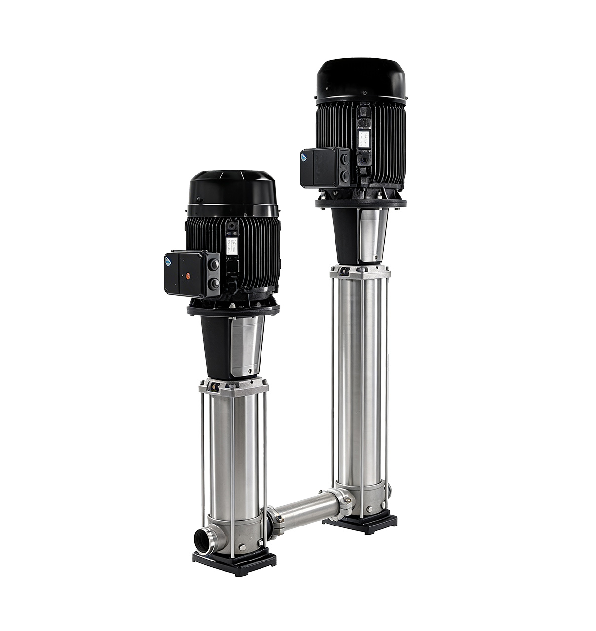 Vertical, multistage centrifugal pump with suction and discharge ports on the same level. Pump materials in contact with the liquid are in high-grade stainless steel (EN 1.4401)